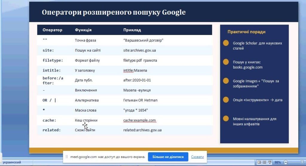 У лекції було висвітлено сучасний цифровий інструментарій історика-дослідника: методи ефективного пошуку в наукових базах даних, робота з українськими та європейськими цифровими архівами, інструменти розпізнавання рукописів і перекладу середньовічних текстів, а також можливості й академічні ризики застосування штучного інтелекту в наукових дослідженнях. Окрему увагу приділено питанням академічної доброчесності в умовах цифровізації науки.